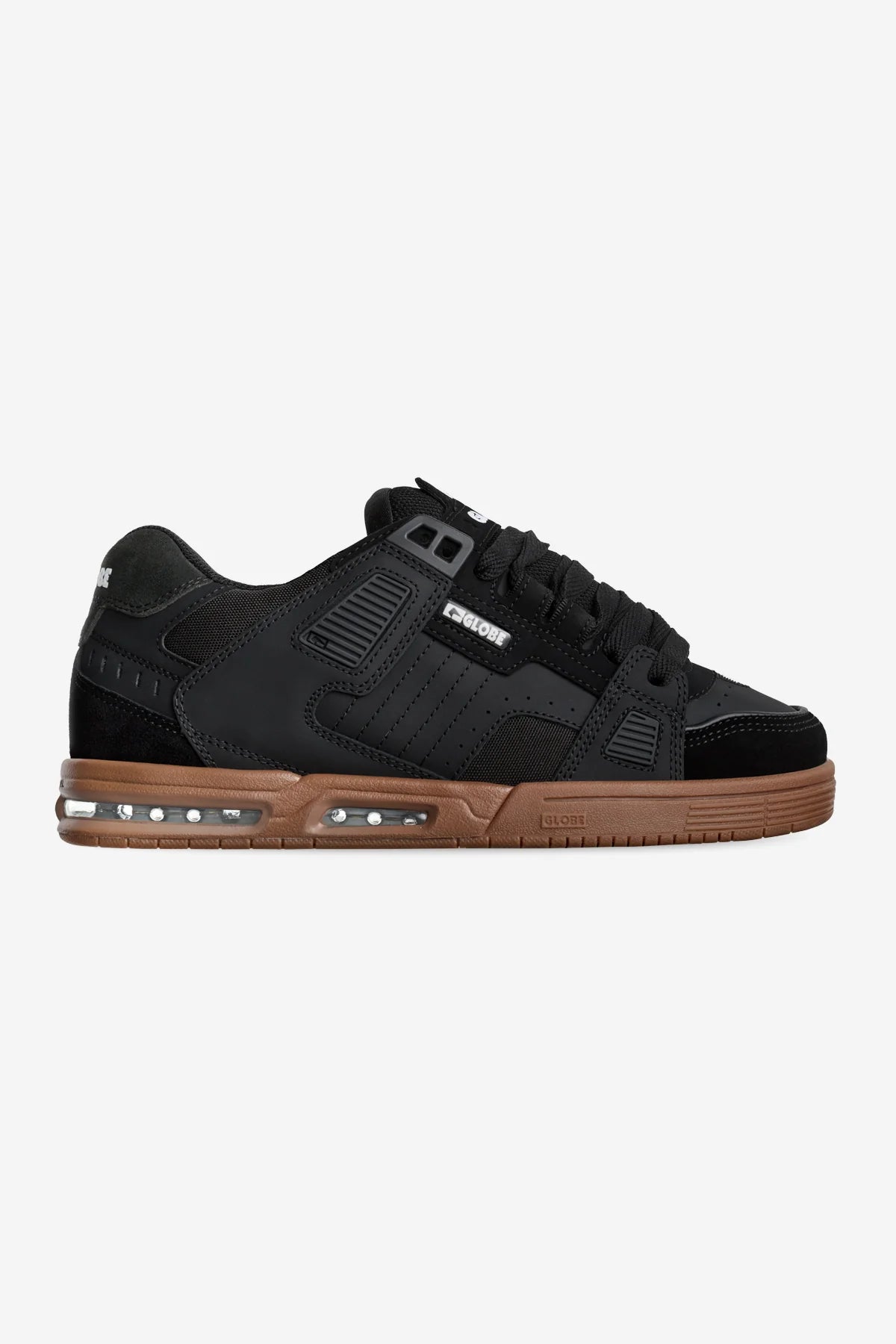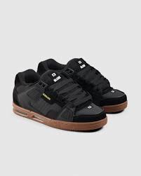 The Globe Sabre in Onyx/ Gum is a rugged high performance skate shoe with a Nitrocel™ airbag sole, step-in sock liner, S-Trac grip for impact protection and board feel. Its padded collar, reinforced upper, and breathable design ensure comfort, durability, and performance.