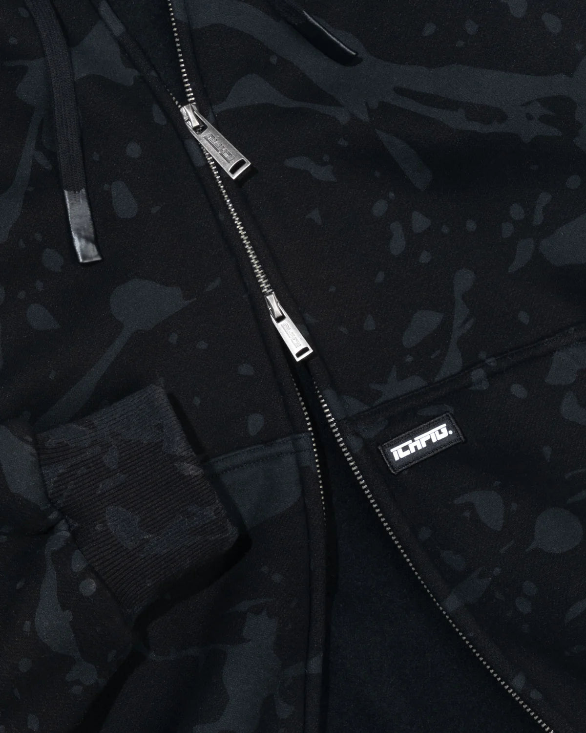 - 360gsm brushed poly / cotton full zip hooded jacket with custom yardage splatter print- ICHPIG® woven badge at left pocket corner- Double entry kangaroo pocket with branded double ended metal zips- Boxy fit with thick ribbed cuffs and hem