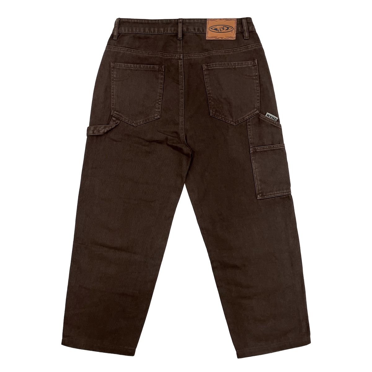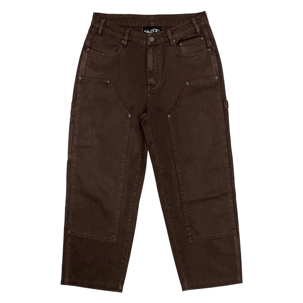 DESIGNED BY SARAH MEURLE BROWN CONTRAST STITCHING, CARPENTER POCKET, DOUBLE KNEE PATCH, EMBROIDER ON HAMMER LOOP, FAUX LEATHER PATCH, METAL RIVETS ON FRONT.