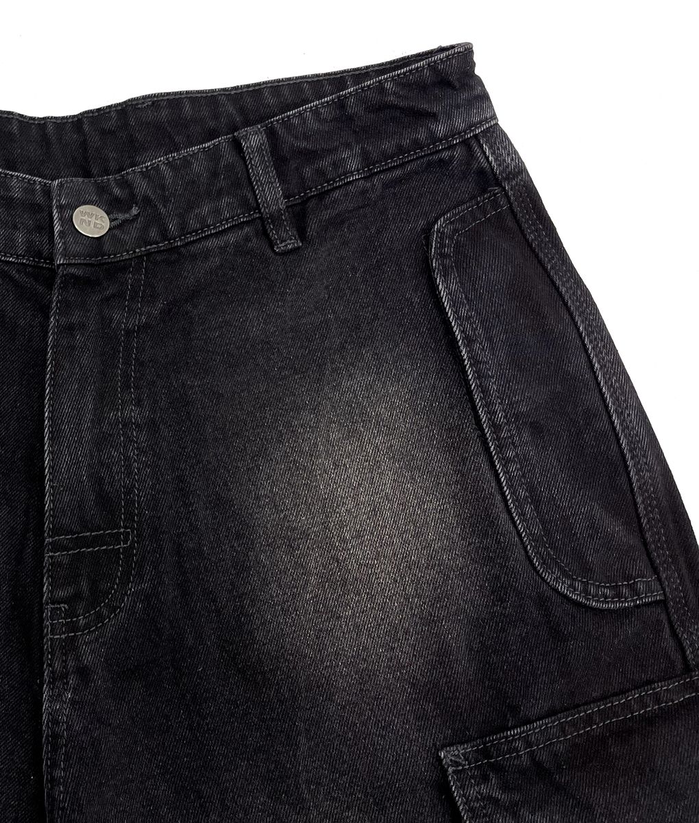 100% COTTON DENIM - FADED DETAILING - CARGO POCKETS WITH BUTTON CLOSURE, INTERNAL DRAWSTRING WAISTBAND, TWILL ANKLE DRAWSTRING, LASER PRINT PRINT ON POCKET, RIGID WAISTBAND WITH BUTTON CLOSURE, AND ZIPPER FLY.