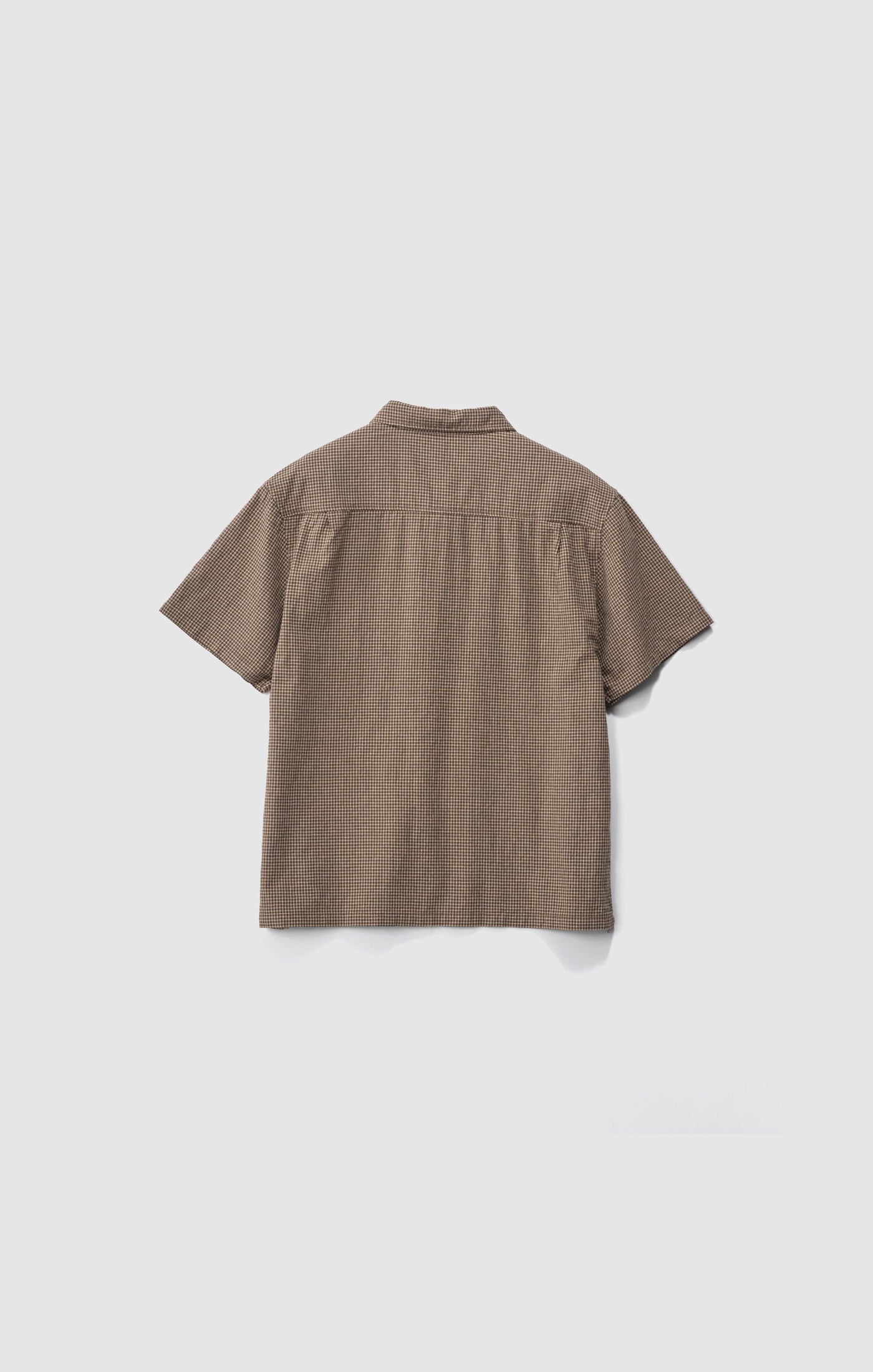 Woven label on pocket- Button up front- Soft washed finish- Branded buttons- Curved hem- Medium weight cotton yarn dyed check